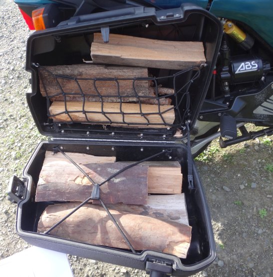 Since I could fit everything I needed for an overnight trip in my top case and tank bag I loaded up both of my side cases with kindling and firewood before leaving home: