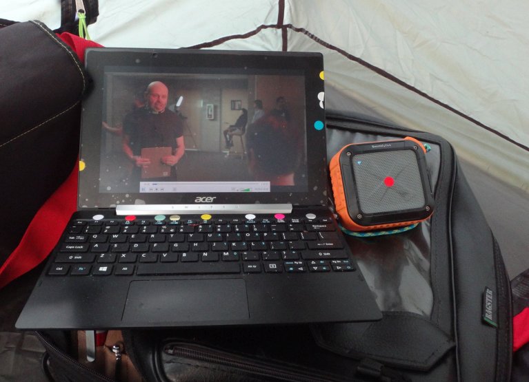 Since I had some free time until sunset I watched a movie on my Acer 10.1" hybrid Win 10 netbook. The speakers aren't great so I use a Bluetooth speaker which sounds much better. I also use the speaker for campsite music from my phone.