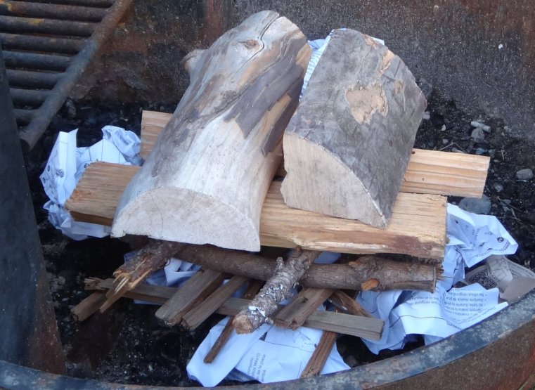 As a Boy Scout and lifelong pyro, I know how to build a fire: 1 - Paper 2 - Cedar kindling 3 - Twigs 4 - Soft wood to get the fire going 5 - Hard wood that burns slowly and has good embers